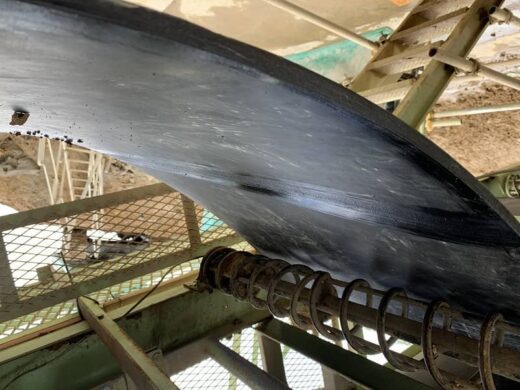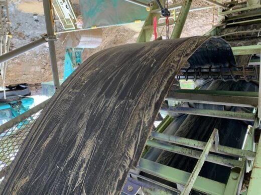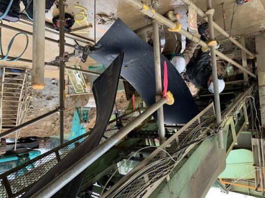 土壌改良プラント様において、プラントの心臓部ともいえるメイン搬送ラインの超大型コンベヤベルト交換、および現地エンドレス加工(熱間加硫接着)を実施いたしました。